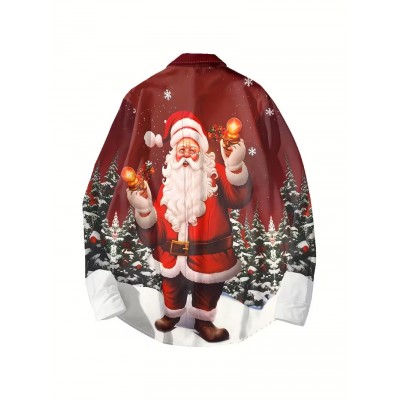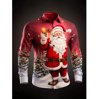 [Christmas Santa Print Shirt] Christmas Santa Print Long Sleeve Shirt - Polyester 100%, Regular Fit, Casual Lapel Collar, Button Detail, 120gsm - Perfect for Halloween, Thanksgiving, New Year Celebrations